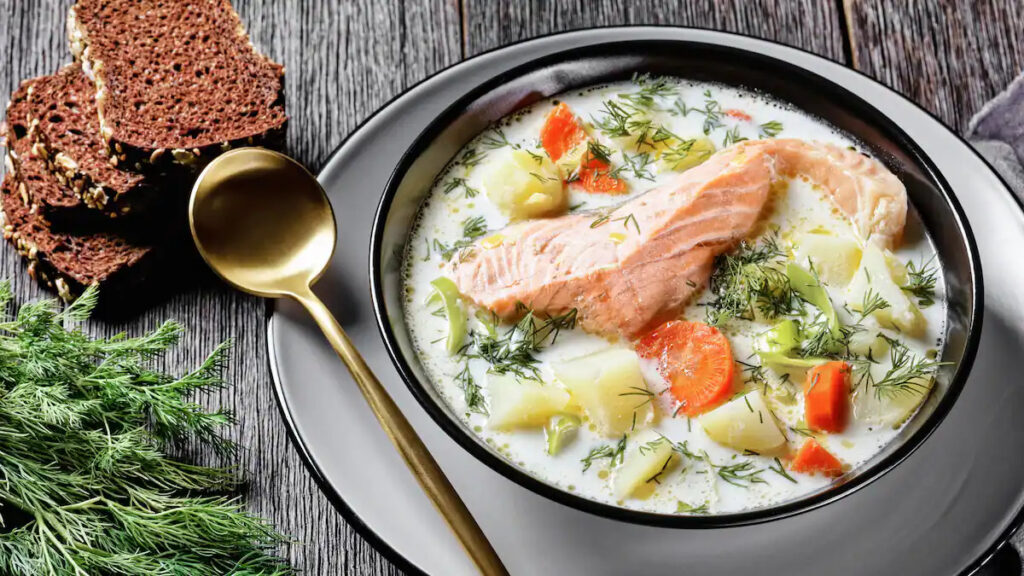 Evenings celebrate the country’s lakes and wilderness. Creamy salmon soup, served with sweet