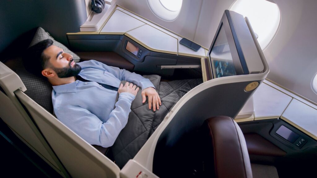 The elevated Business Class is home to 44 Business Studios, each featuring a sliding door that provides enhanced privacy within the suite for each guest. Each Business Class seat faces forward and offers direct aisle access, ensuring optimal comfort and convenience. It converts into a fully flat bed of 79 inches in length, with ample storage for convenience. Noise-cancelling headphones and an 18.5-inch TV screen provide a cinematic experience to enjoy Etihad’s extensive inflight entertainment offering. The Business seats also feature a built-in wireless charging dock and Bluetooth headphone pairing.
