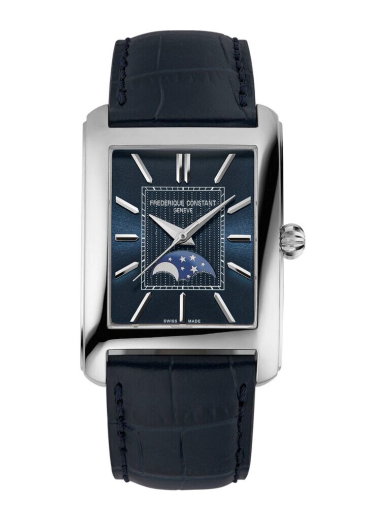 Frederique Constant has perpetuated this style tradition whilst adding its own contemporary take with a more rectangular shape, 42.3mm high and 30mm wide. This generous format highlights the three central hands and Moon Phase whilst also making the dial easy to read and providing a satisfying visual sense of equilibrium. The dial features twelve faceted applique hour markers accompanied by dauphine hour and minute hands and a second hand, all three of which are hand-polished. The central pattern is surrounded by a ‘railway’ or ‘sector dial’ minute track, another typical feature of watches of the Twenties and Thirties.