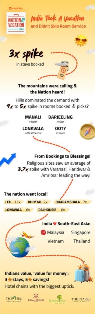 A 3x spike in hotel stays was recorded, with hill destinations leading the demand. Manali, Darjeeling, Lonavala, and Ooty topped the charts.