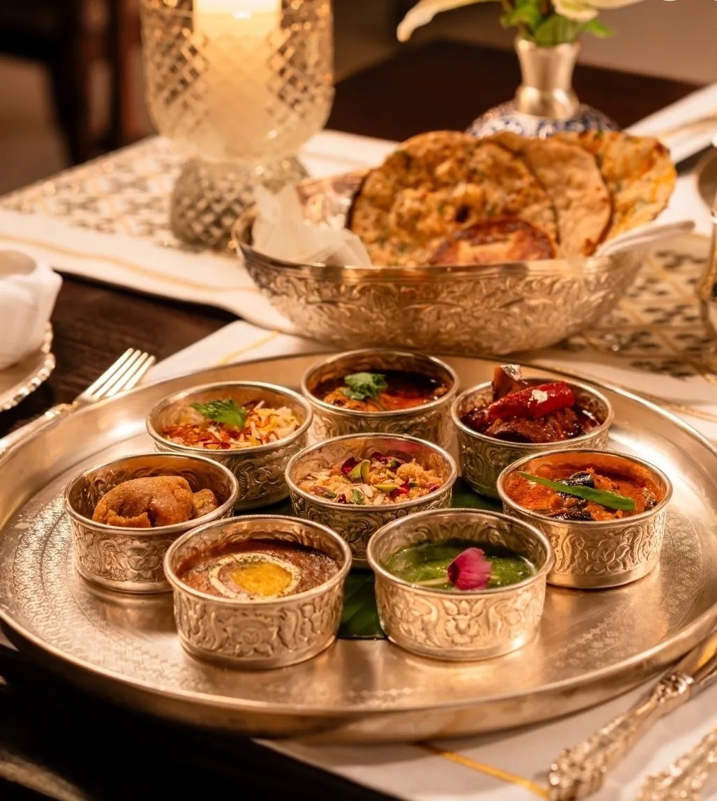 Traditional sweet delicacies such as Ghewar, Badam Halwa, and Seviyan ka Muzaffar complete out the meal.