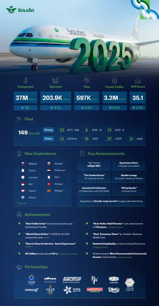 Saudia, the national flag carrier of Saudi Arabia, recorded significant growth in its operational performance throughout 2025, while continuing to leverage its international flight network to enhance transit traffic yields. The airline transported approximately 37 million guests, reflecting a 6% increase compared to 2024.