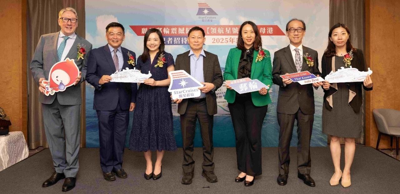 StarCruises press conference in Hong Kong: Representatives from the StarDream Cruises management, Hong Kong Tourism Board (HKTB), Tourism Commission & Travel Industry Council, launching the Star Voyager sailings from Hong Kong starting on 27 June 2025. Mr Colin Kerr, SVP, Entertainment, StarDream Cruises (from left); Mr Michael Goh, President, StarDream Cruises; Miss Anges Ho, Acting Deputy Commissioner for Tourism Commission; Mr Colin Au, CEO & Executive Director, StarDream Cruises; Ms Marilyn Tham, General Manager, Mega Events, MICE & Cruise of Hong Kong Tourism Board, Mr Tommy Tam, Chairman of Hong Kong Travel Industry Council and Ms Ling Sit, AVP – Sales, StarDream Cruises.